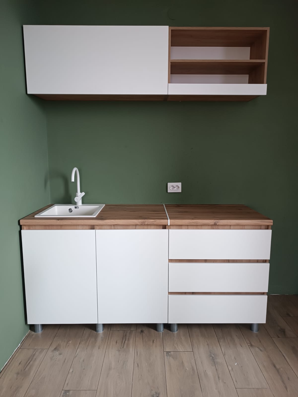 Верхний модуль шириной 1000мм открывается с помощью газлифтов захватом снизу и разделен на две секции: широкую- под сушку для посуды и небольшую секцию с полкой. Второй верхний открытый модуль шири